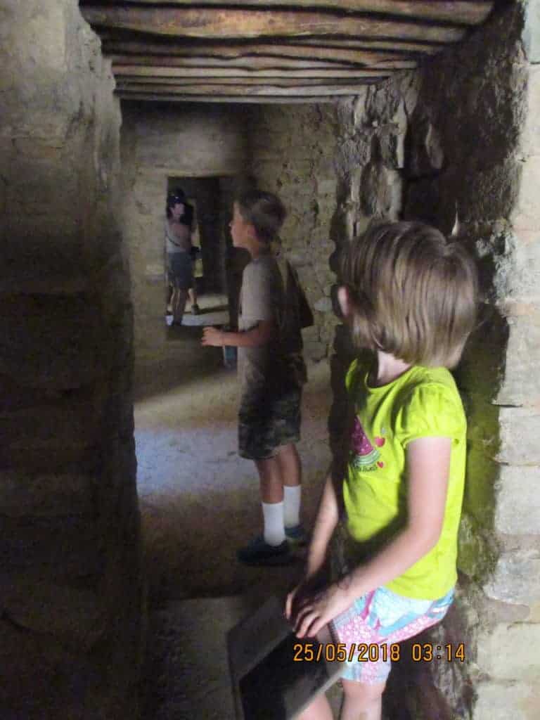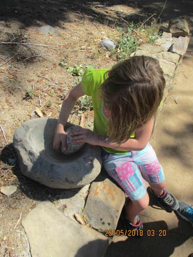 My kids enjoyed exploring the interiors (so dark and small — how on earth did they live like this?) and using tools, like this metate for grinding corn.
