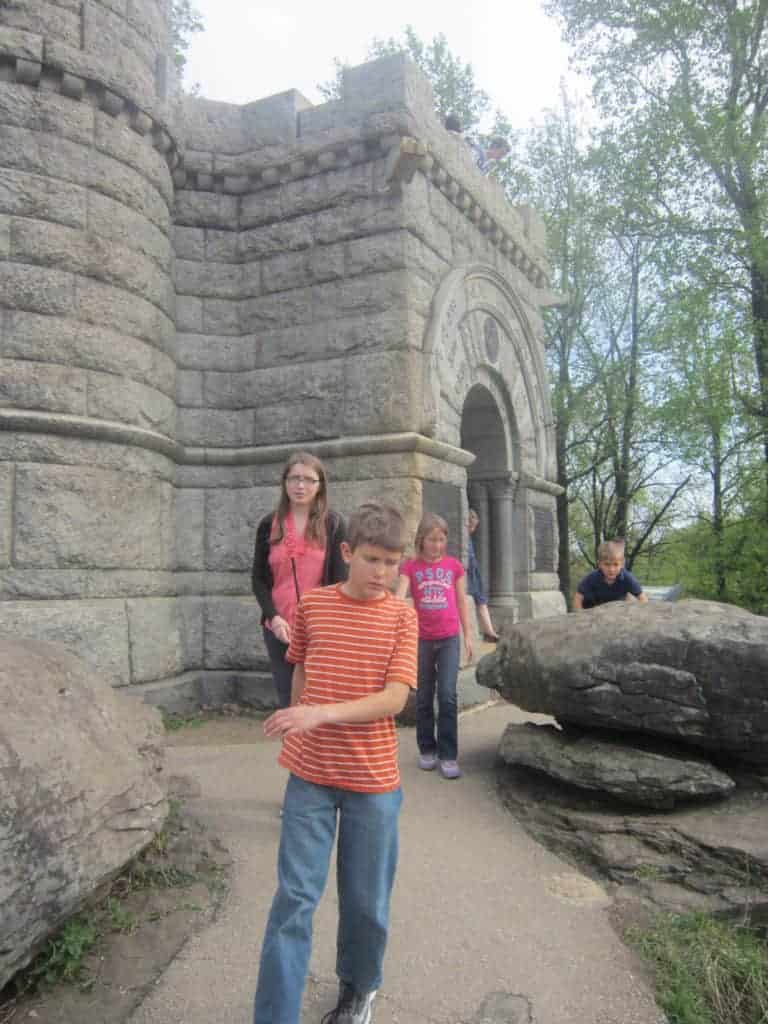 Our next stop was Gettysburg, PA, where they have a fantastic visitor’s center and museum, with Civil War artifacts and a film. We then drove out onto the battlefield with a little map outlining what happened and where. It is extremely beautiful countryside and my little kids liked getting out at the various stops and climbing on rocks, even if they weren’t particularly interested in the history. My older kids were familiar with the history, so the places we visited were significant and meaningful to them.