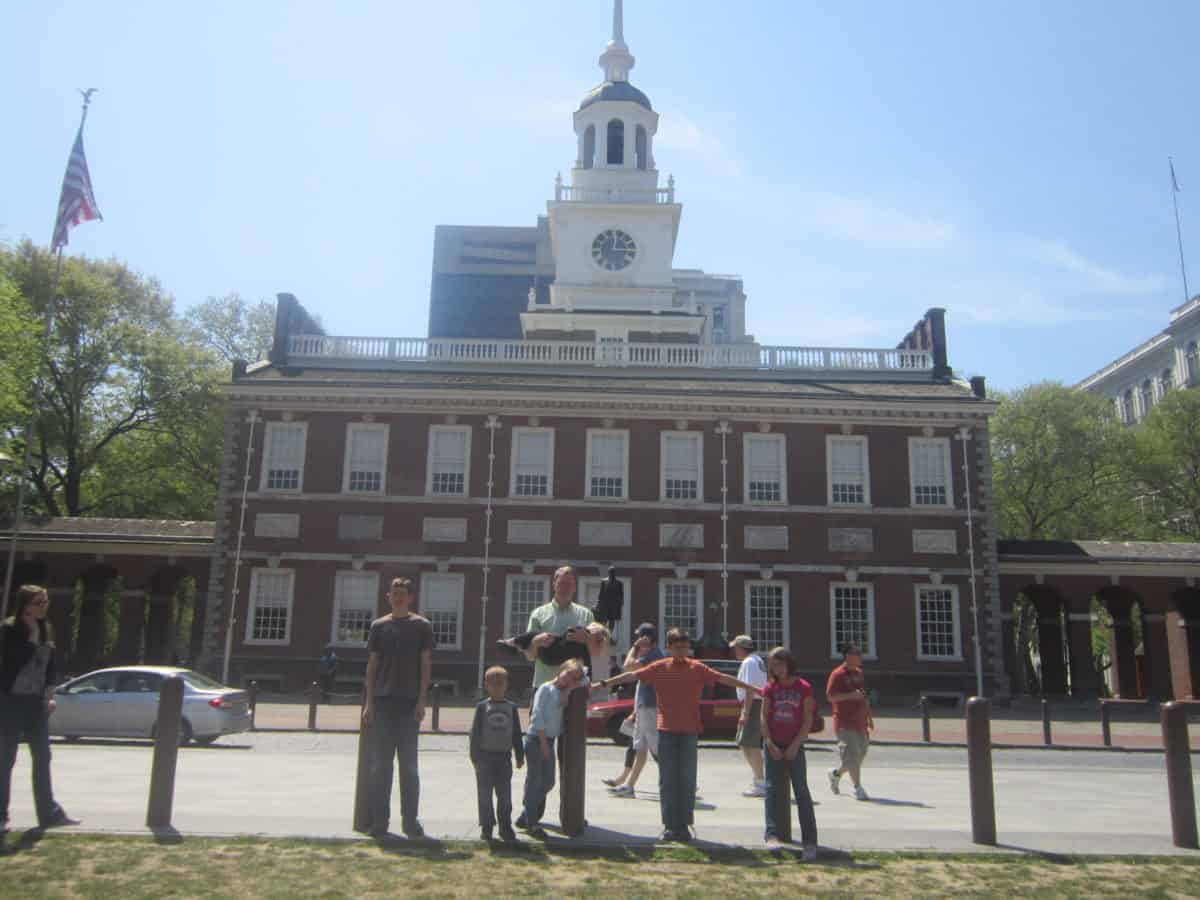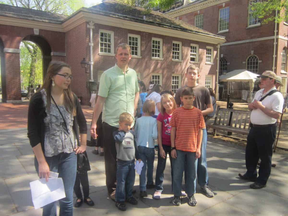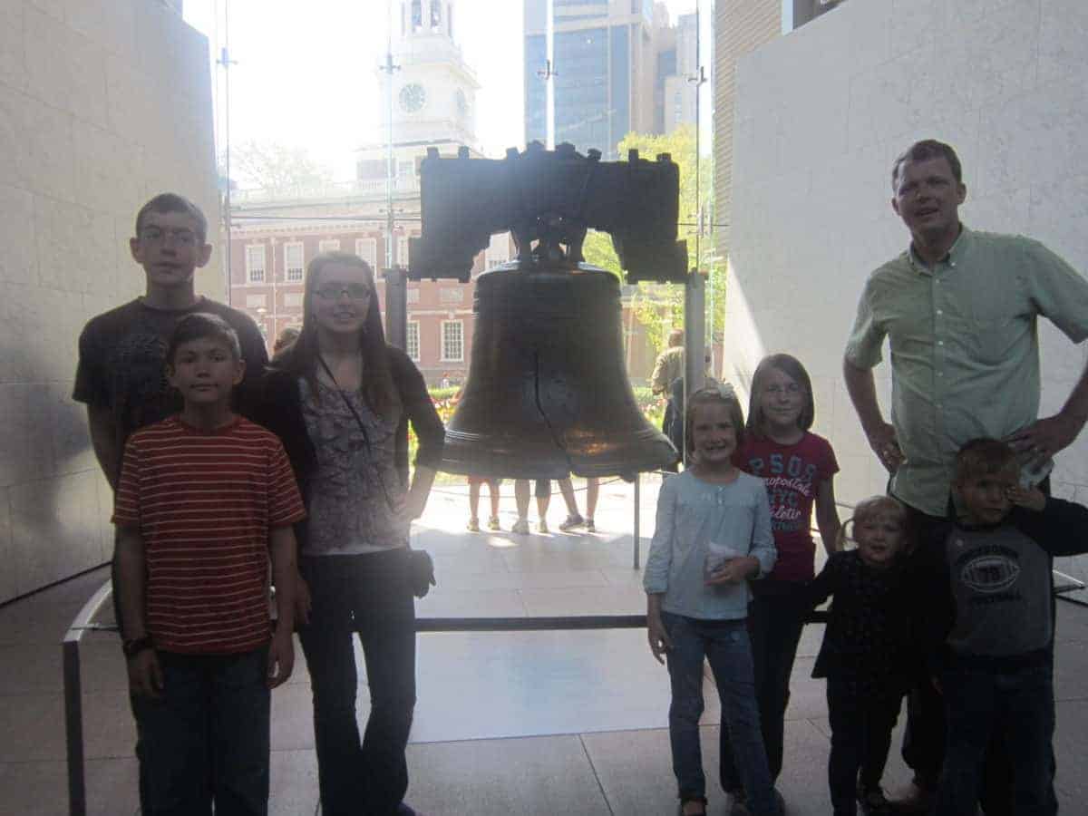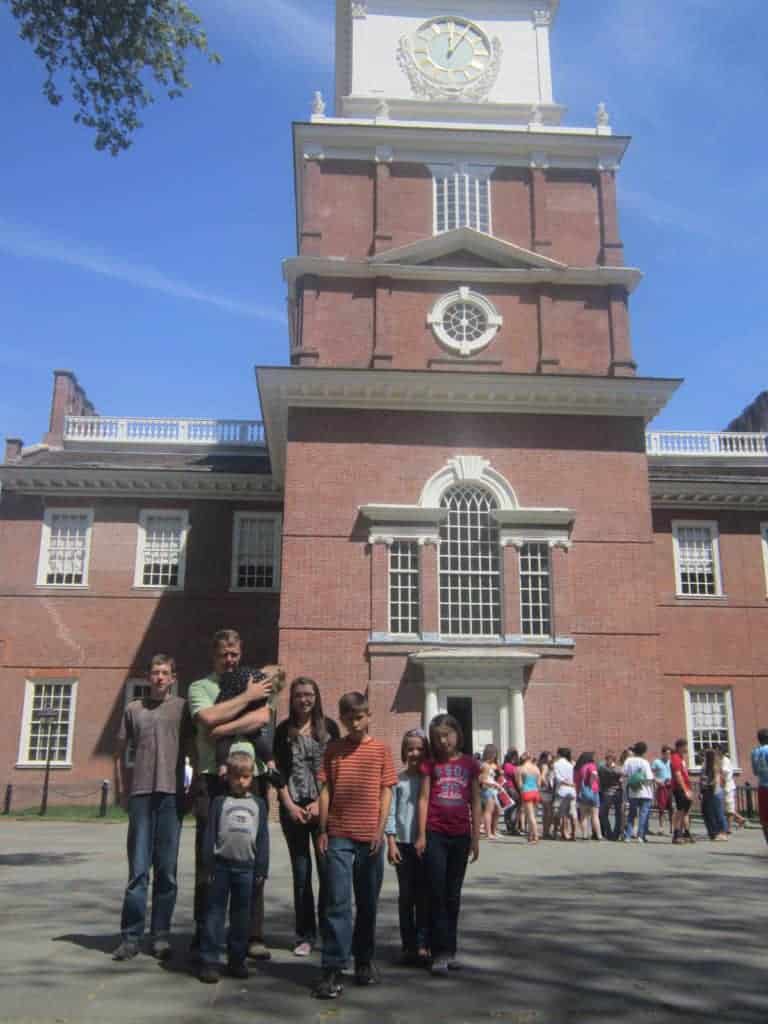 Philadelphia, PA, was only about 2 hours down the road from Gettysburg. Unfortunately, our GPS took us to a parking garage in a VERY SCARY looking part of Philadelphia instead of to Independence Hall. The parking attendant turned us away because our van was too large. As we drove along a one-way street, trying to find Independence Hall, we suddenly stumbled upon it. Without thinking adequately, the kids and I all piled out of the van at an intersection, as quickly as a pregnant mom with seven kids can pile out, and ran for the common. The plan was that Kendel would find a place to park while I obtained tickets and then we would meet up. Unfortunately, I had left my phone in the van and had no way to contact Kendel, and the grassy, common area between Independence Hall and the Liberty Bell was a giant mass of people.