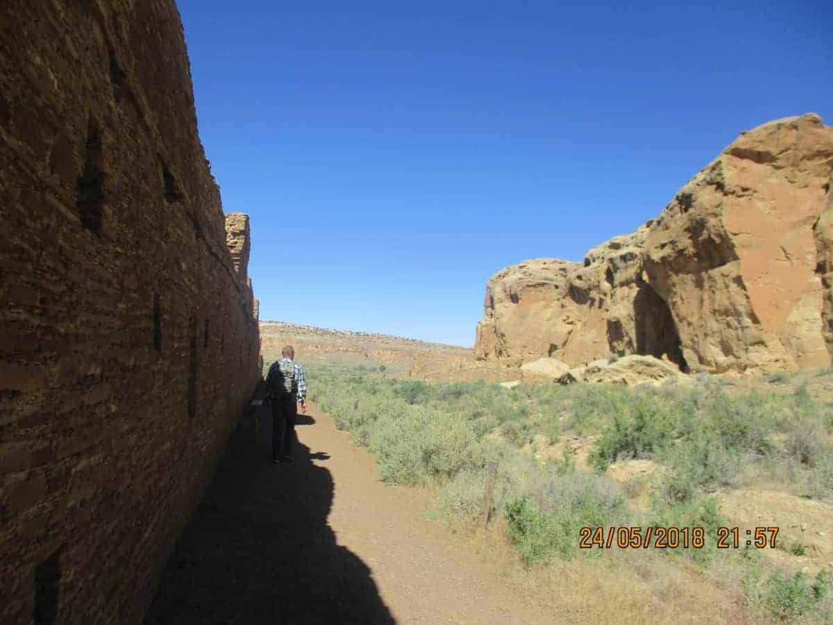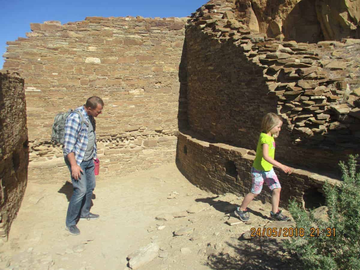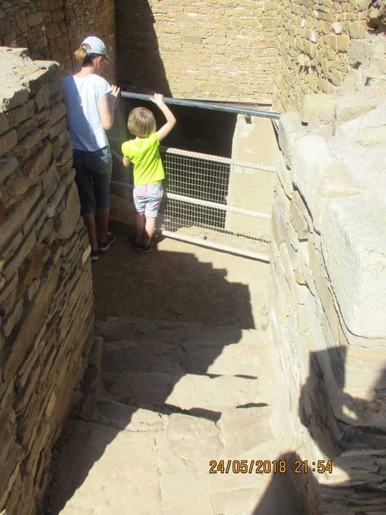 Our next stop was Chetro Ketl and Pueblo Bonito, two communities another 10 minutes down the loop road. All of these communities were probably built around the same time and would have associated with one another. There is evidence of old roads between the communities in this canyon and distant ones, too. Chetro Ketl and Pueblo Bonito are just a five-minute walk apart, and Pueblo Bonito is much, much larger. We joined a ranger-led tour at Pueblo Bonito, for a few minutes, but the littles weren’t very interested so we went our own way.