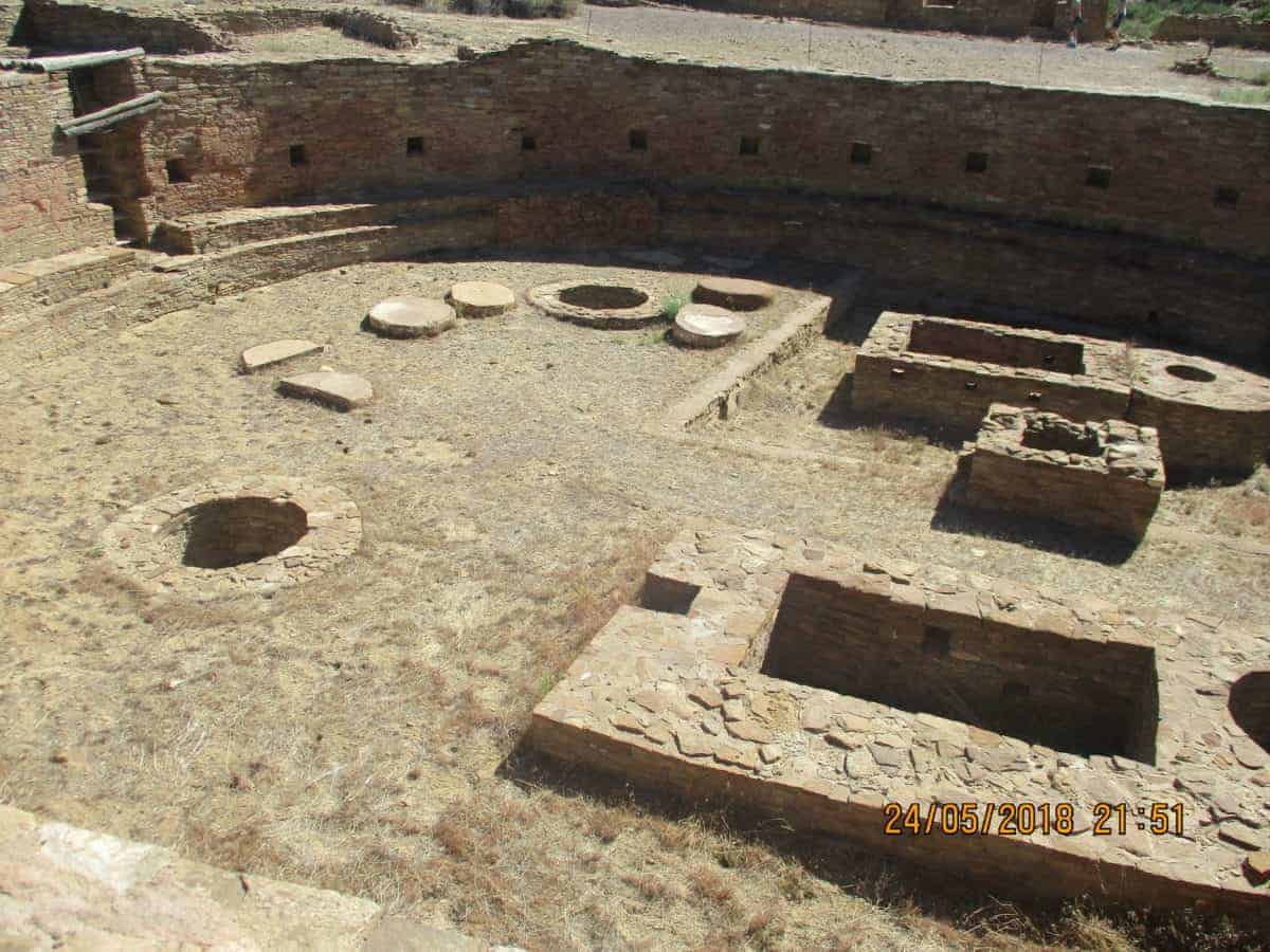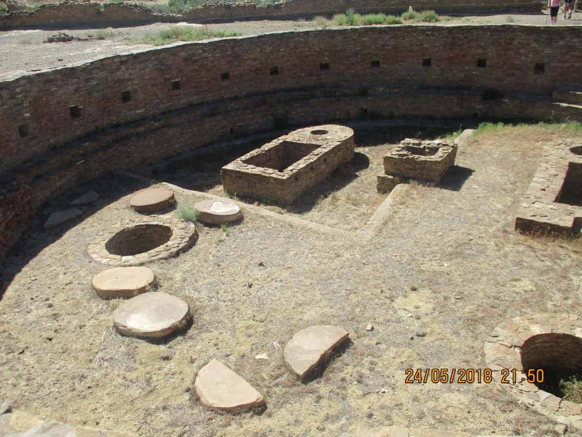 The round, underground structures are kiva’s, used mainly for worship. The would have had wooden rooves on them, supported by pilasters around the exterior walls. Each family in the community would have had a small kiva of their own, for personal use, and the large kivas would have been used by the community.