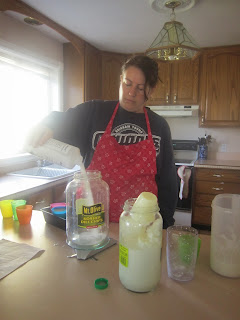 3. Add the lye, slowly, to the slushy milk. NEVER add the liquid to the lye, it could explode! Having the milk partially frozen helps the chemical reaction to take place more slowly, which keeps your milk from curdling. The milk will turn yellow as the reaction occurs. See how yellow it is?