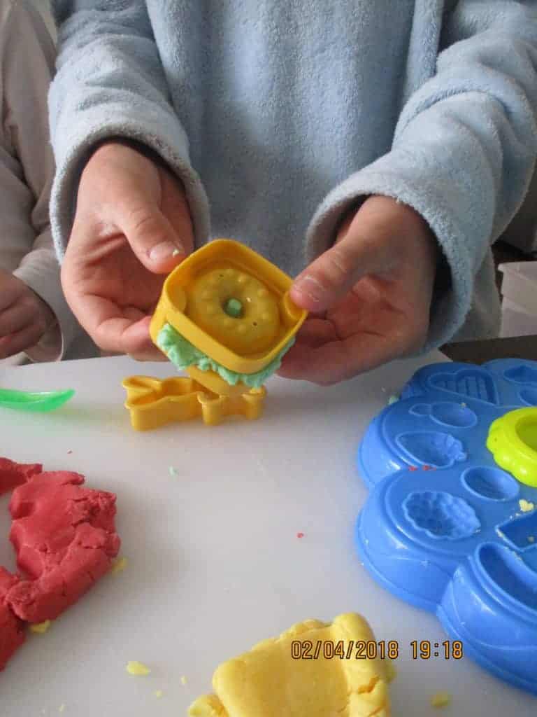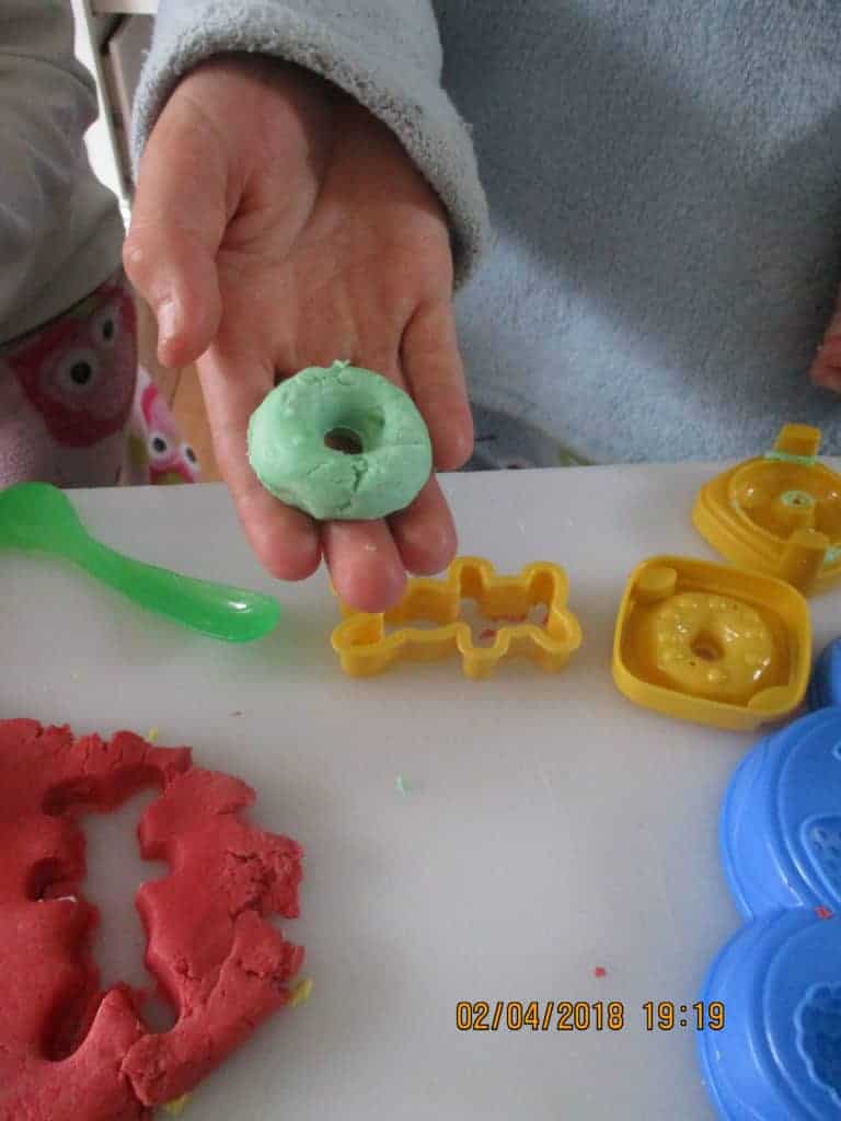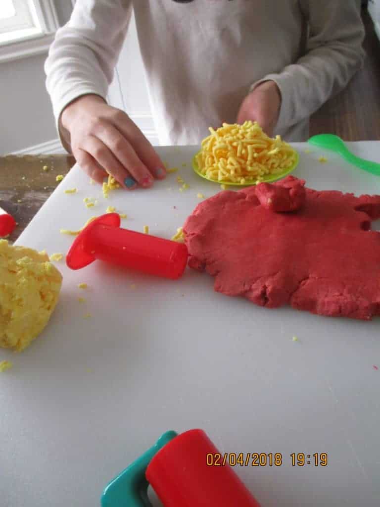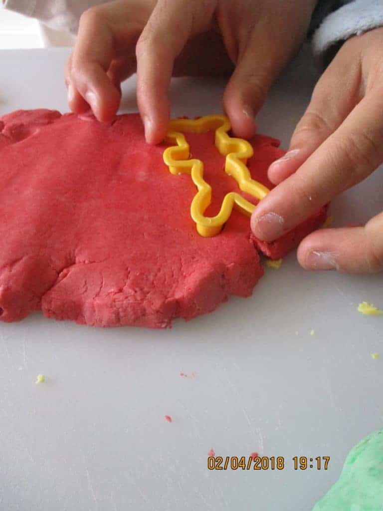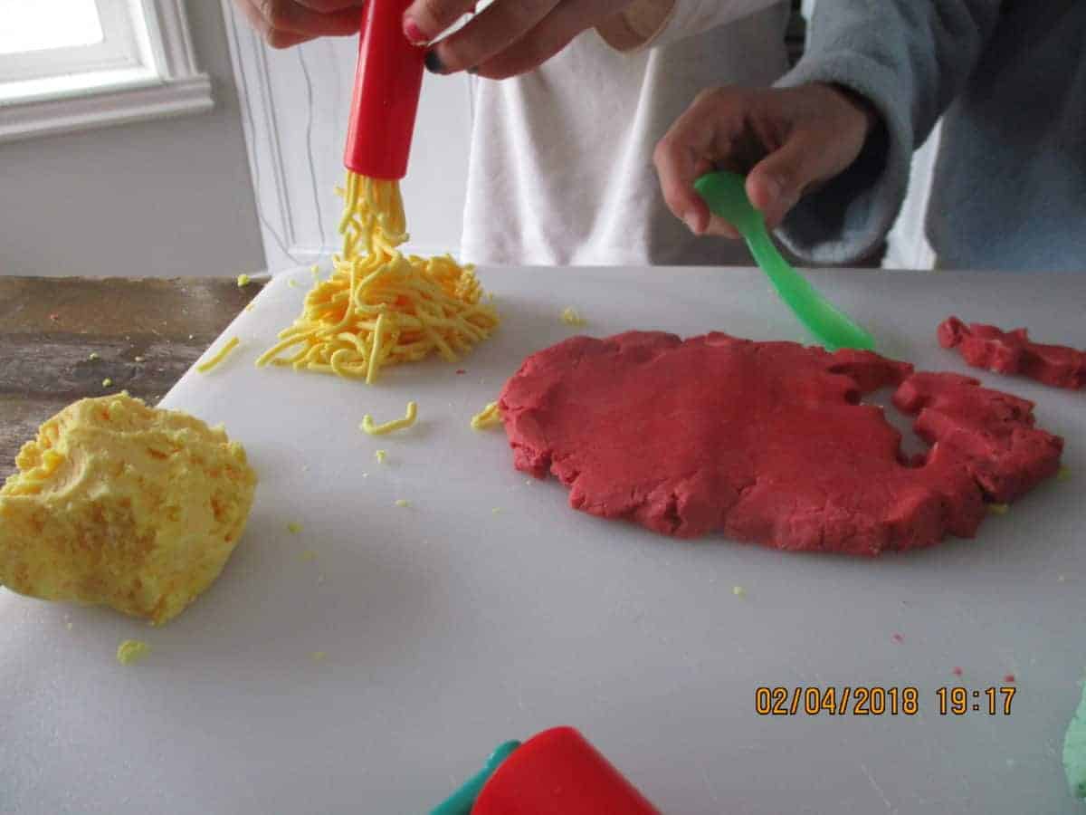 Roll your play dough into sections and make sure they aren’t crumbly or sticky. If you accidentally added a little too much powdered sugar, don’t worry! Just sprinkle a little olive oil onto the play dough and knead! Problem solved!