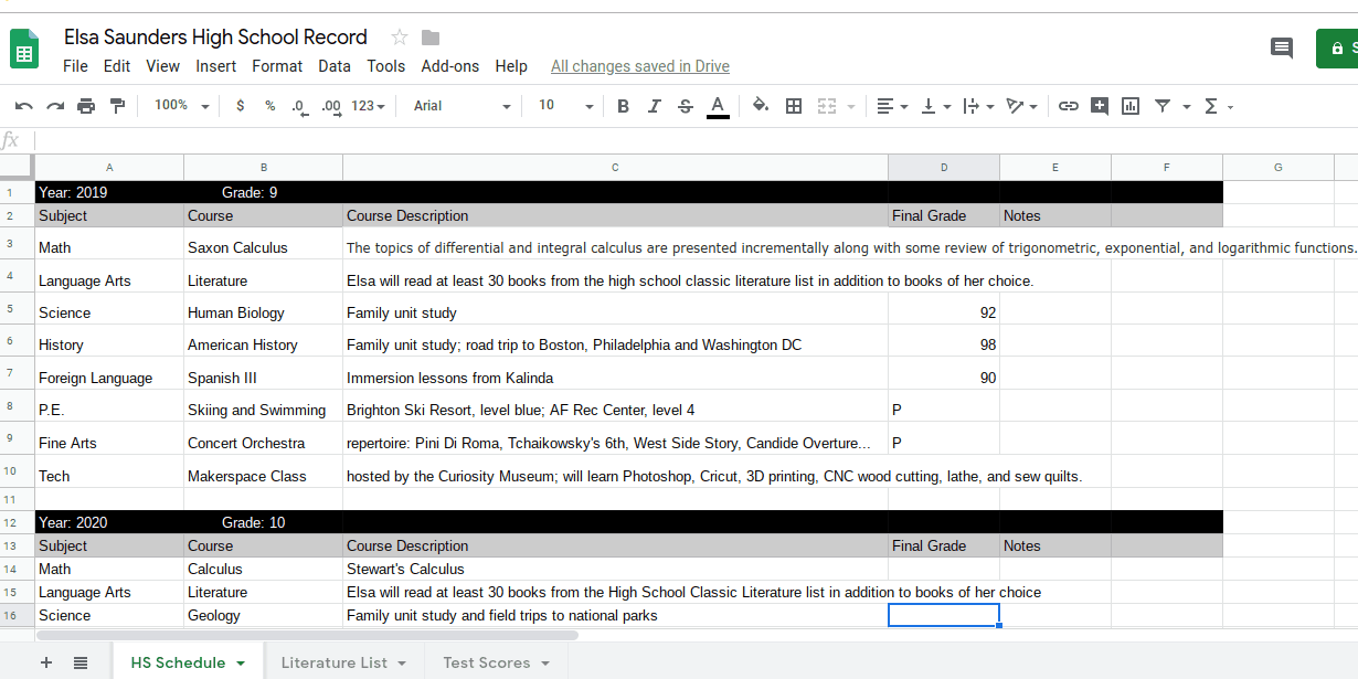 You can also enroll in one of many different homeschooling oversight programs that will provide record keeping services for you. My neighbor uses an accredited program (which requires her to submit portfolios) that also provides a transcript for her kids. But I think it’s actually easier (and cheaper!) to create my own transcripts.