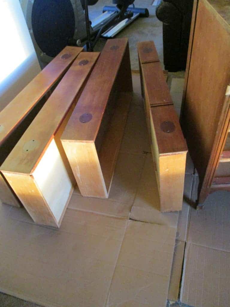 First, remove the hardware. I’ve seen people paint around hardware and hinges and it ain’t pretty! Remove the drawers and set them aside, with the surface-that-shows upright and horizontal. You’ll paint those separately. Now, clean it really well, inside and out! I use water with a dash of liquid dish detergent. You don’t need to worry about the finish at this point.
