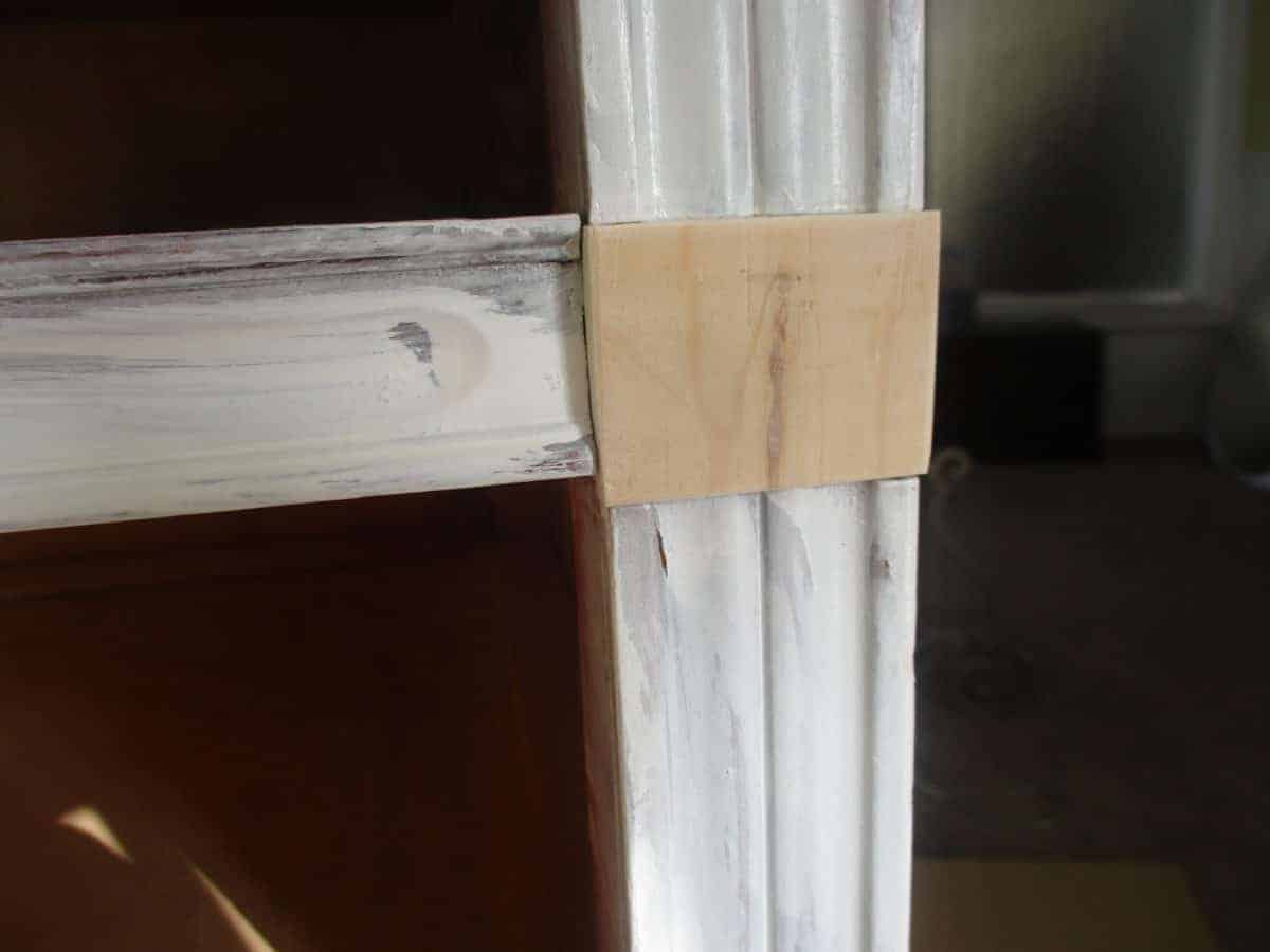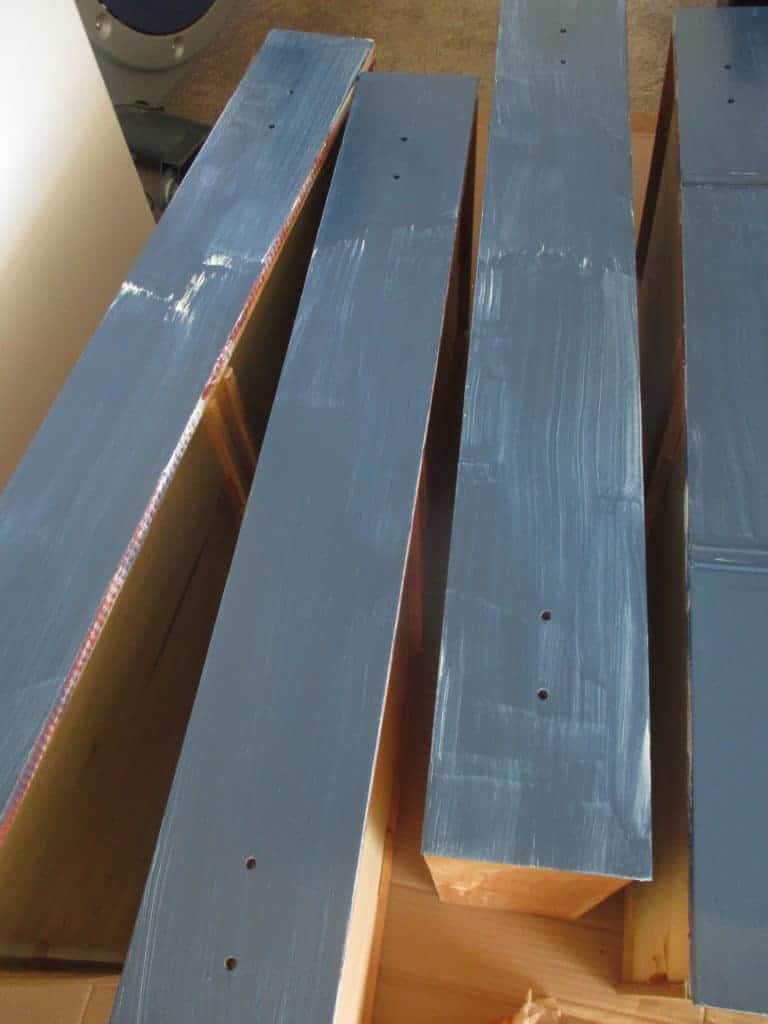 I realize that it’s very old, and that lot’s of people think painting antiques is sacrilege. Sorry, folks! The finish had worn unevenly and it had been abused, and I really just wanted a blue dresser, so I couldn’t stop myself! It also had these two little applique pieces missing, and I wasn’t about to try to restore it. I just hurriedly made little plain squares of fir and glued them in. That’s how I roll.
