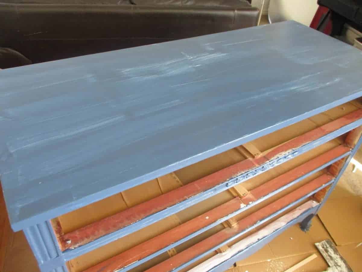 For furniture, I use interior latex in either semi-gloss or gloss enamel finish. The glossier the finish, the easier it will be to clean. Paint thin coats and sand between each coat. The farther your final paint color is from the primer, the more coats you’ll have to paint. So if I paint a piece white after priming it white, I will probably just paint 2 coats. This dresser is a navy blue, however, so it took 4 coats to fully eliminate the streaks.