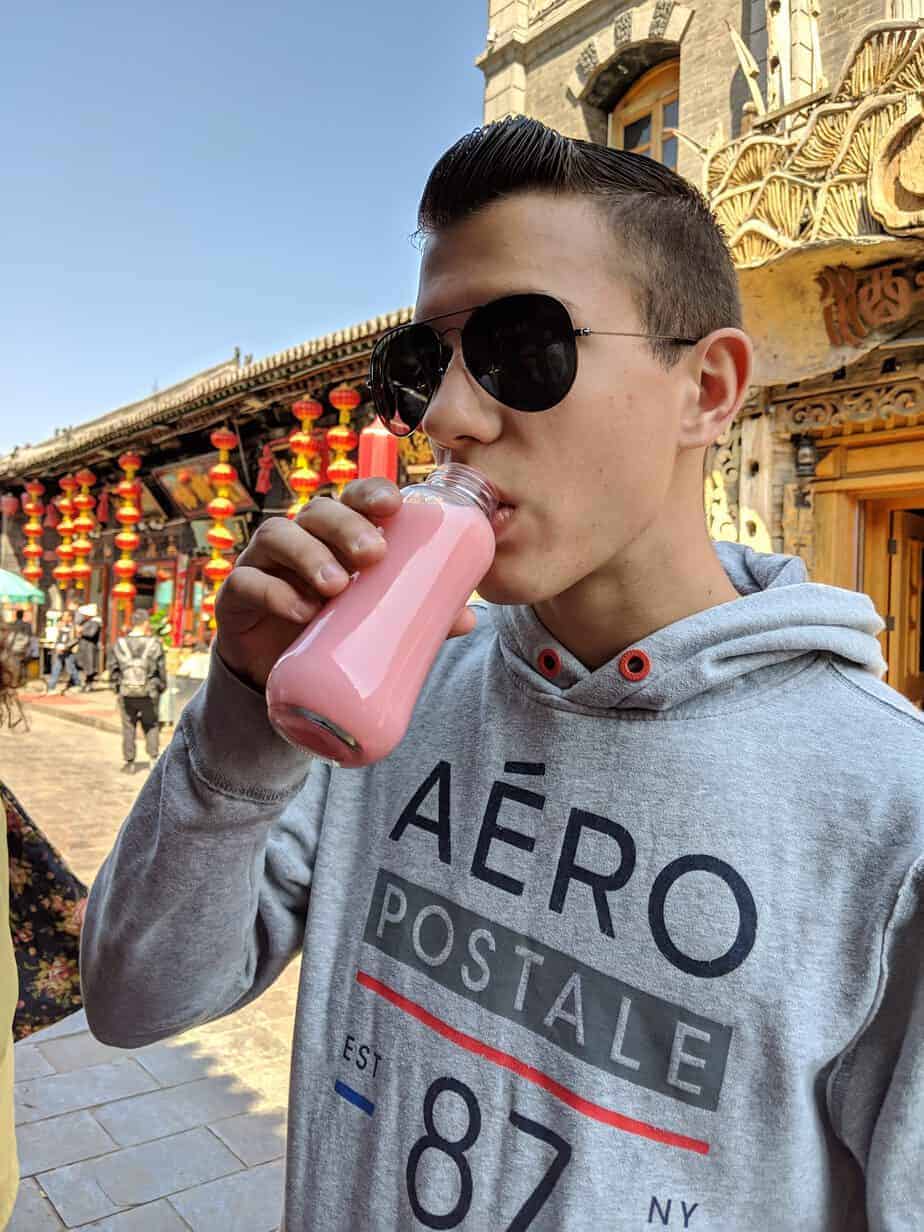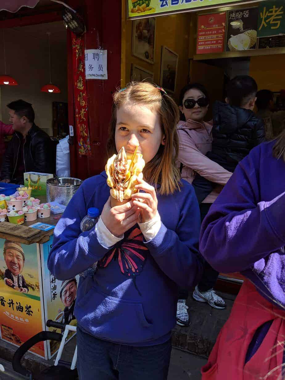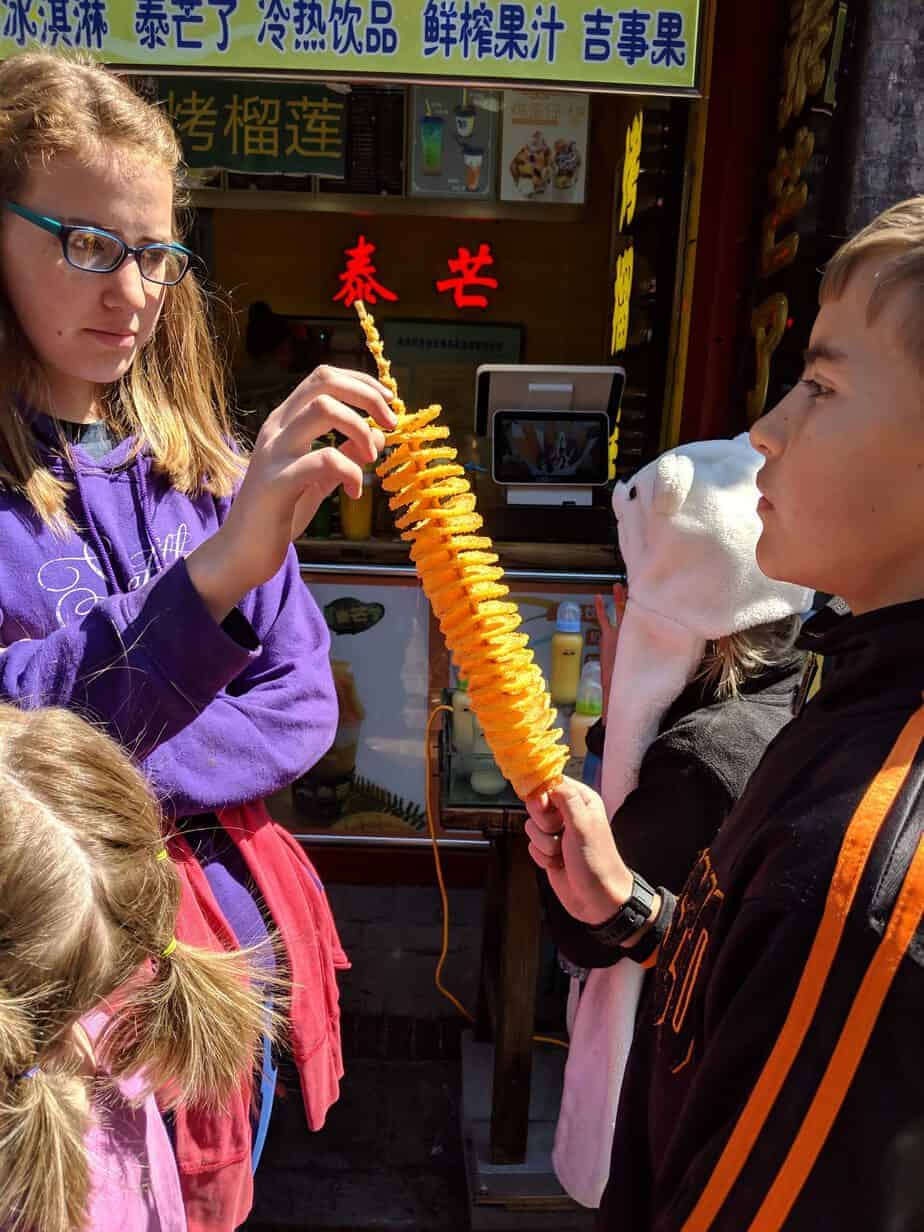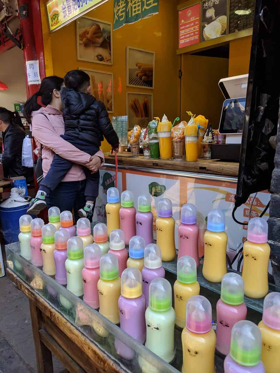 Don’t miss the opportunity to taste some of the delicious food available in Pingyao! There are all kinds of food stalls along the two main shopping streets with yummy snacks like potato tornadoes and ice cream confections and fruit smoothies served in baby bottles.