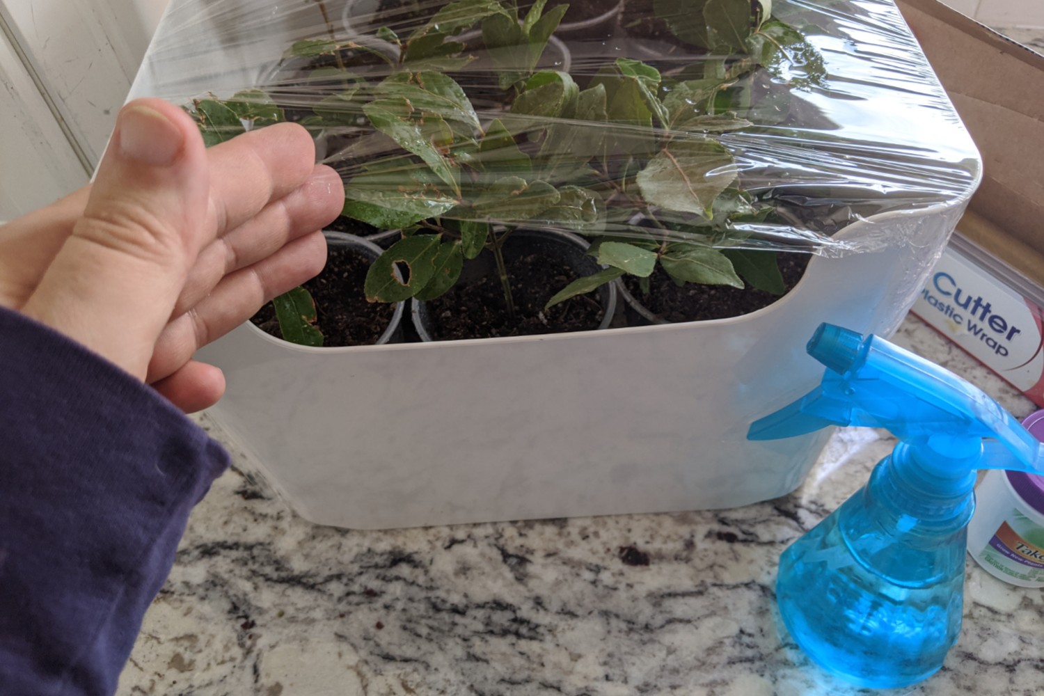 Until the new plants have become fully established, carefully monitor the amount of moisture and light they get. Mist them several times a day to keep humidity high. I always leave a small uncovered area, or turn back a corner of the plastic wrap so as not to overheat my little “greenhouse”. You can see that in the pictures here.