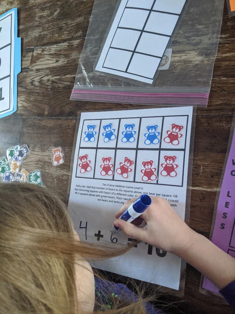 First, have your child roll a die and complete the number sentence at the top with the rolled number. Next, have them build the rolled number in the second ten frame, so each ten frame uses a different color counter, like in the photo.