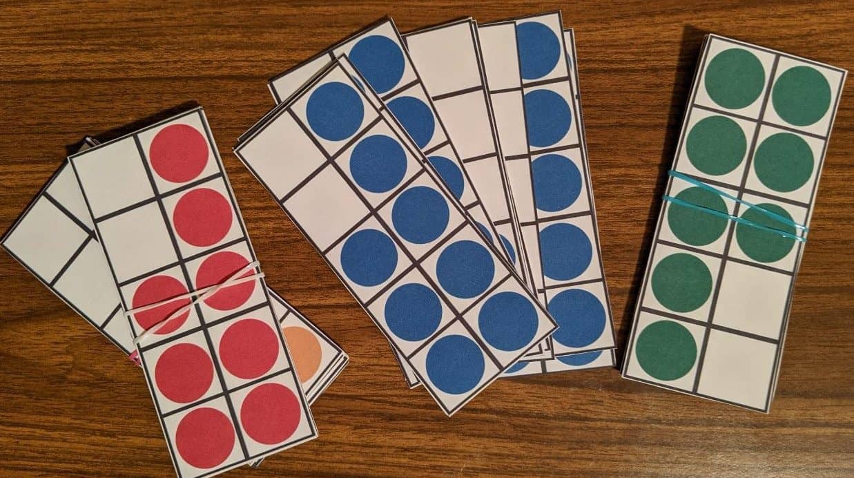 So now I just use plain, old, colored circles. This 5/8″ circle punch is the perfect size for these ten frames, and it makes the job easy. I don’t even laminate them. I just punch a zippered sandwich bag each of red, blue, green and yellow from colored cardstock, and when I need new ones I just punch a bunch more.