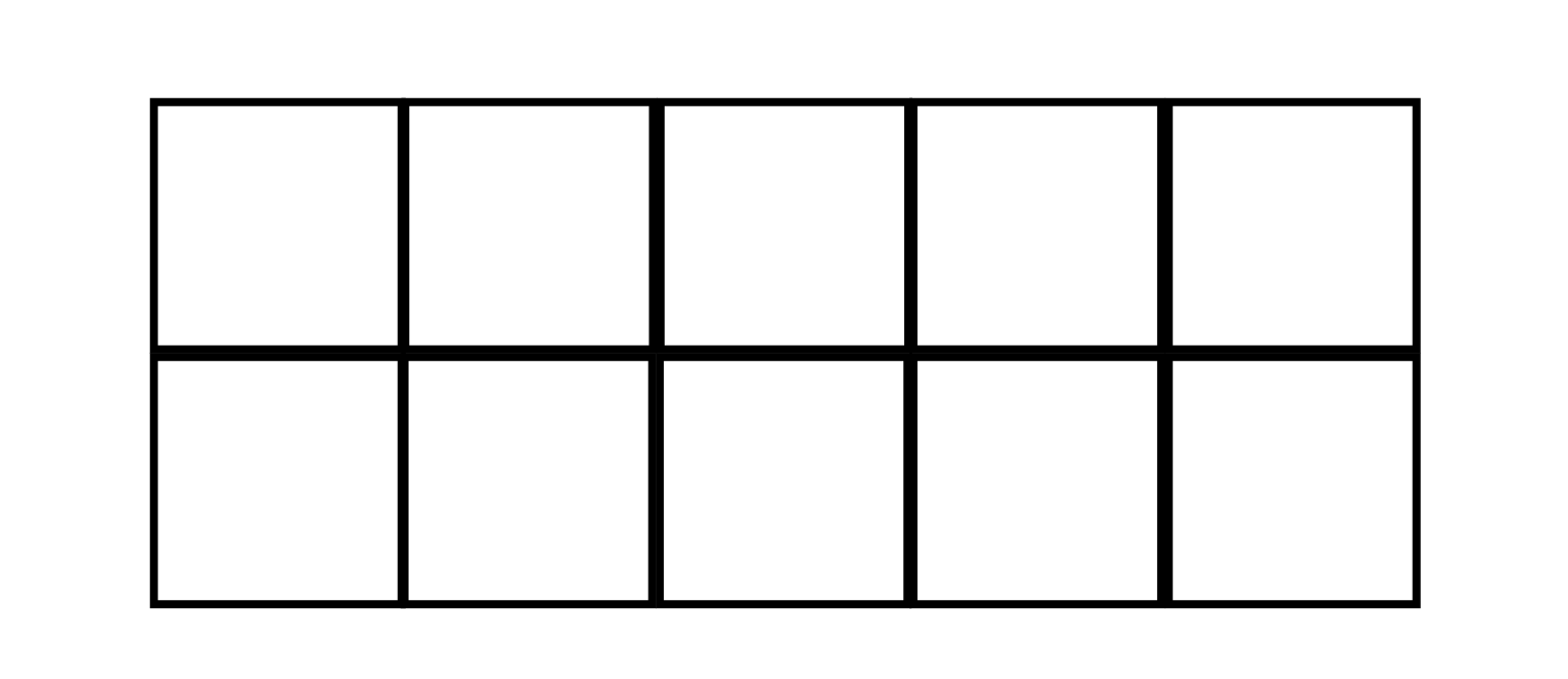 A ten frame is a long rectangle consisting of ten equally-sized boxes in a 2 x 5 array, hence the name ten frame. The photo to the right is a ten frame. Easy, peasy.