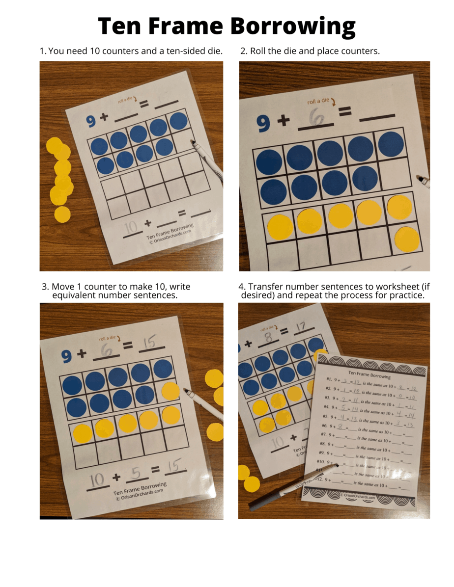 Roll a die. Add that number of counters to the squares, one counter per square (page 1 of the ten frame printable). Fill the remaining squares with counters of a different color. For example, if I roll a 3, I would place one green counter in each in 3 squares. I would then fill the remaining 7 squares with red counters and write the equation 3 + 7 = 10 below. You could play the same thing, but start with 10 counters, roll a die, and subtract the number that comes up.