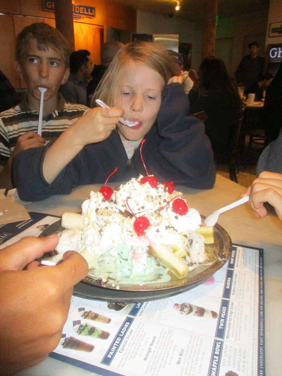My kiddos each wanted their own Earthquake sundaes (it’s something like 8 scoops of ice cream with toppings and cookies!), but I knew they wouldn’t be able to finish them, so we just shared a couple of them. Ghirardelli Square is a must visit when you’re in San Francisco with kids.