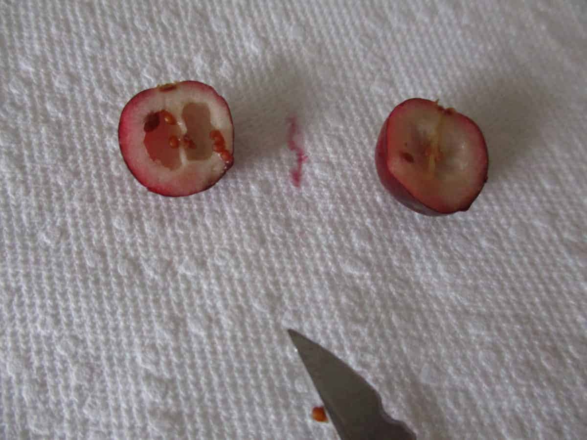 First, we inspected the berries. We talked about characteristics of fruit: the seeds are on the inside (except strawberries) and surrounded by pulp. We speculated that the inside of the berry would contain air pockets, because they floated. Ta-da! There are air pockets surrounding the seeds in the middle of each berry. There are multiple, tiny seeds.