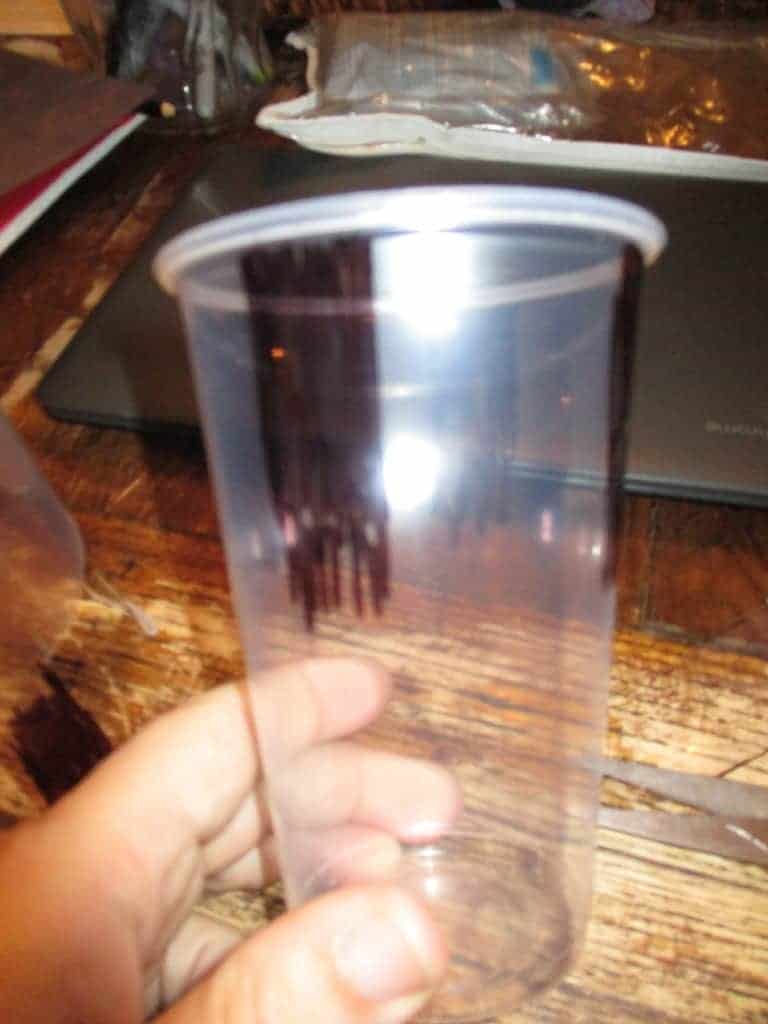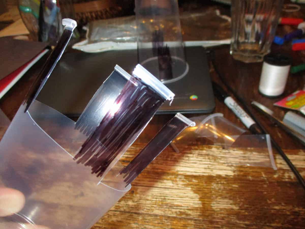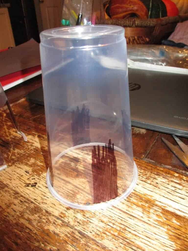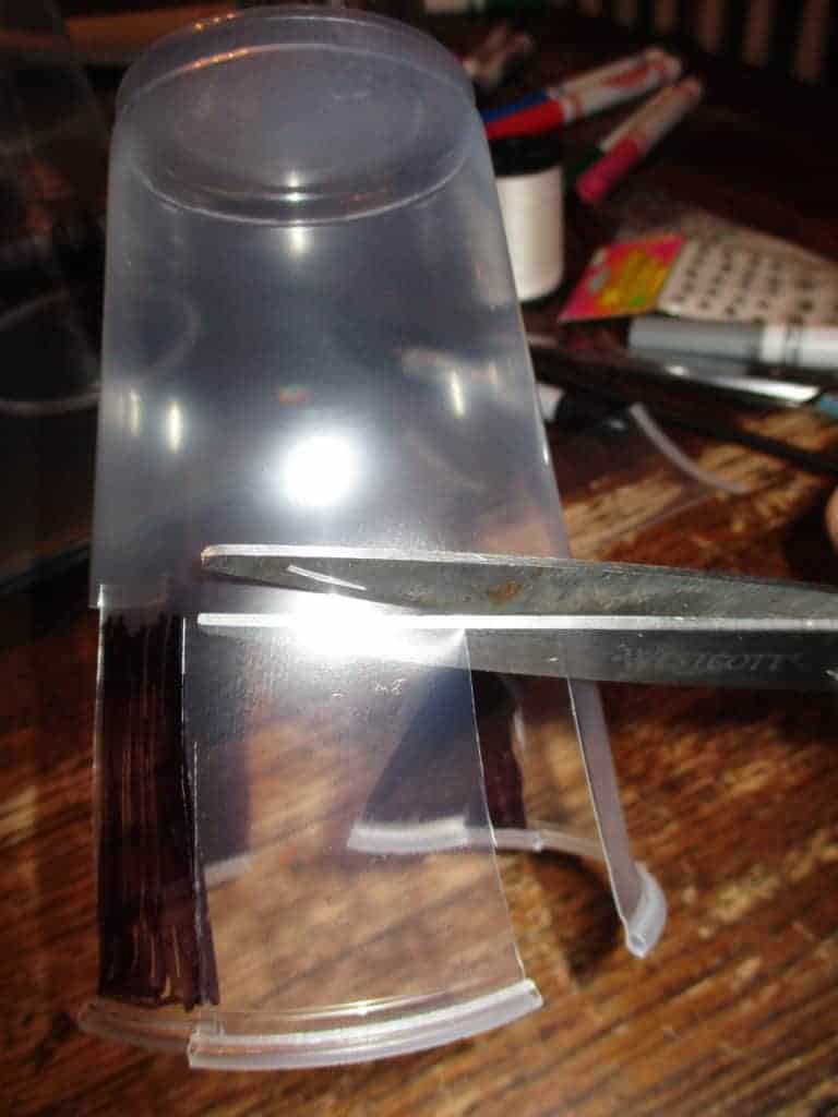 - Color 4 black ‘legs’ on each cup, evenly spaced around the cup. We used plastic cups because it was all I had on hand, but I think the black sharpie would have shown up better on a paper cup, and it would have been easier for the kids to cut.Â