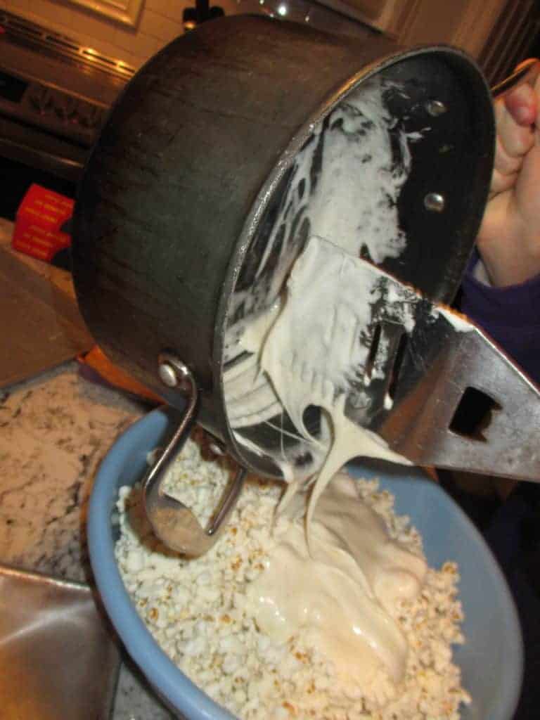 - Add the popped popcorn and mix until the popcorn is completely coated with the Marshmallow Mixture.