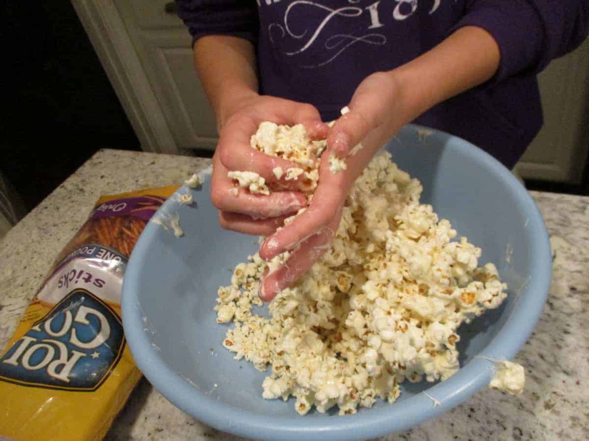 - Form the popcorn mixture into balls with buttered hands.Â