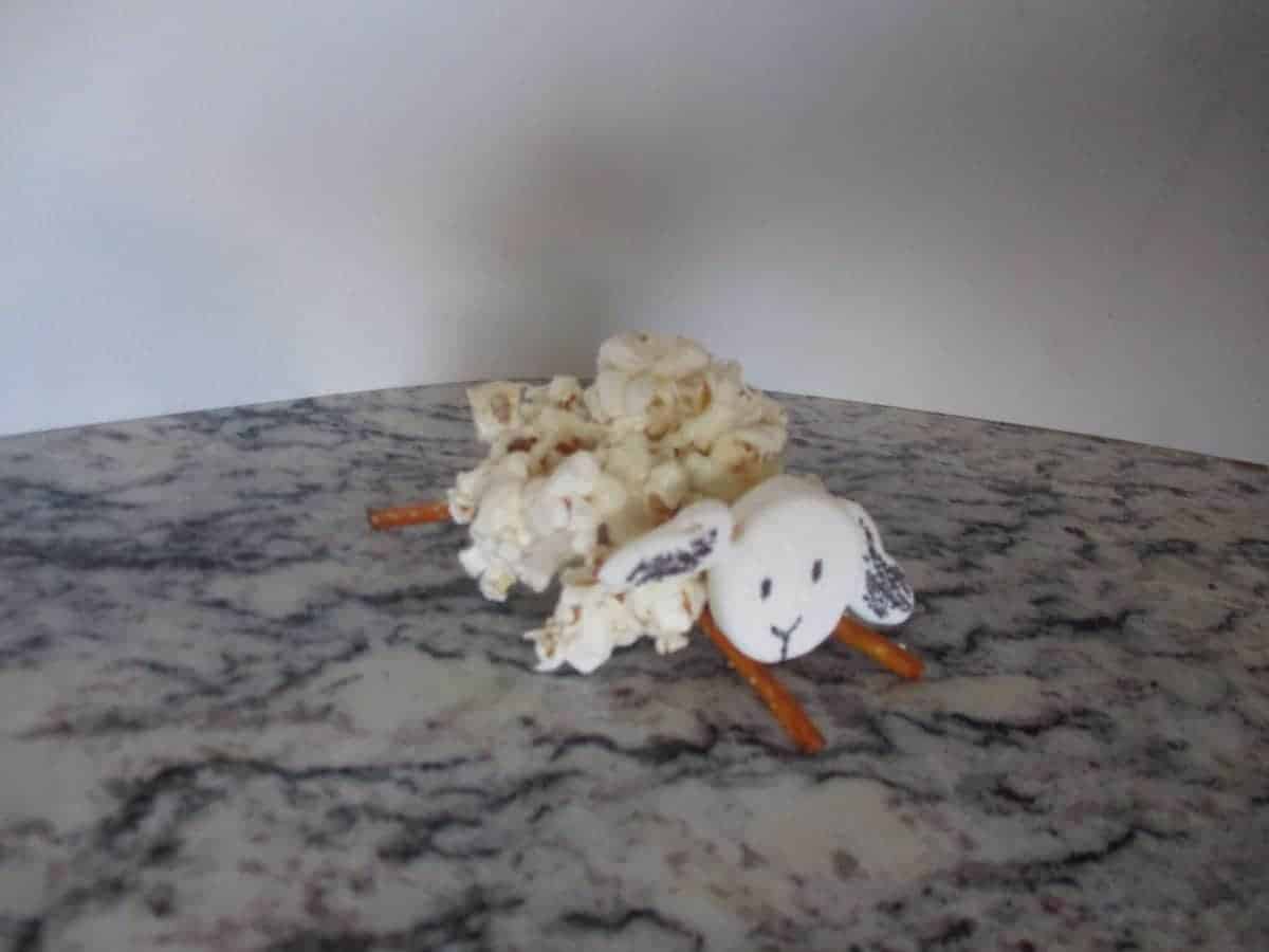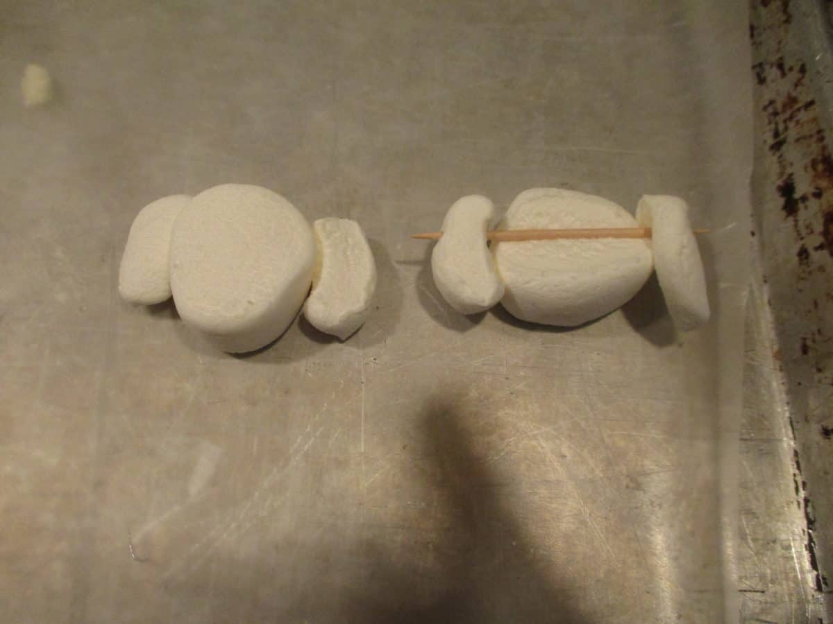 - Cut a large marshmallow in half to make lamb heads. Cut one half in half again (fourths) to make the ears. Attach the ears to the head with a toothpick. They might stick on their own, but ours fell off when jostled, so we used the toothpicks to join them.Â