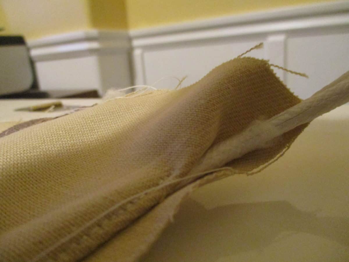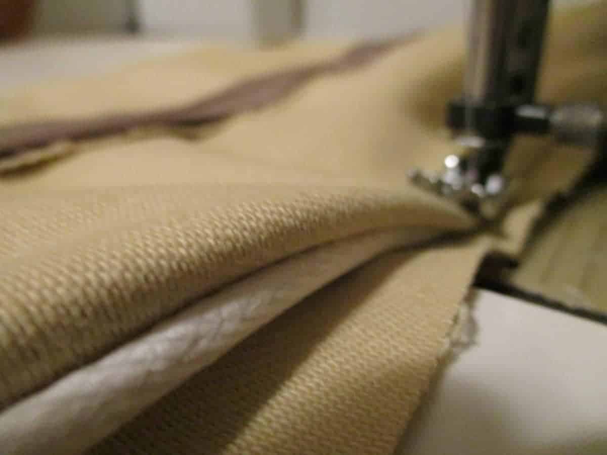 - If your old cushions are still in good shape, remove them from their covers and use the old covers as a pattern for the new. Mine had piping around the top and bottom seams, which I retained in my design. Seat cushion covers are designed to fit tight and will look best if you match the dimensions from your original cushion-covers, which may be slightly smaller, especially in the thickness dimension, than your cushion. You can see from this picture how I sewed the piping into both sides of the ‘thickness’ piece of the cover.