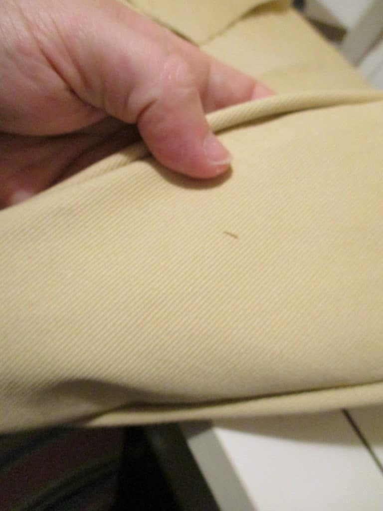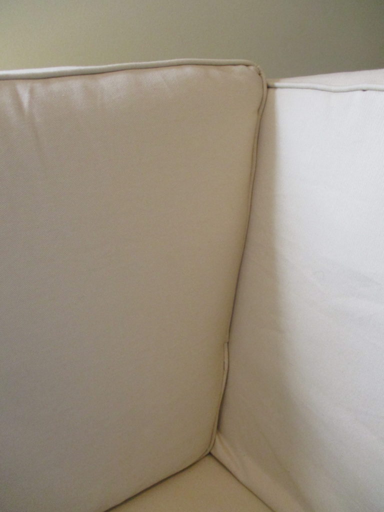 I’ve found that is the easiest way to accomplish evenness. Add zippers only to the back. Really, the easiest way to do this is to copy the design of your old cushions, by carefully ripping the seams apart and using them as a pattern. Above is a picture of the zipper insertion.