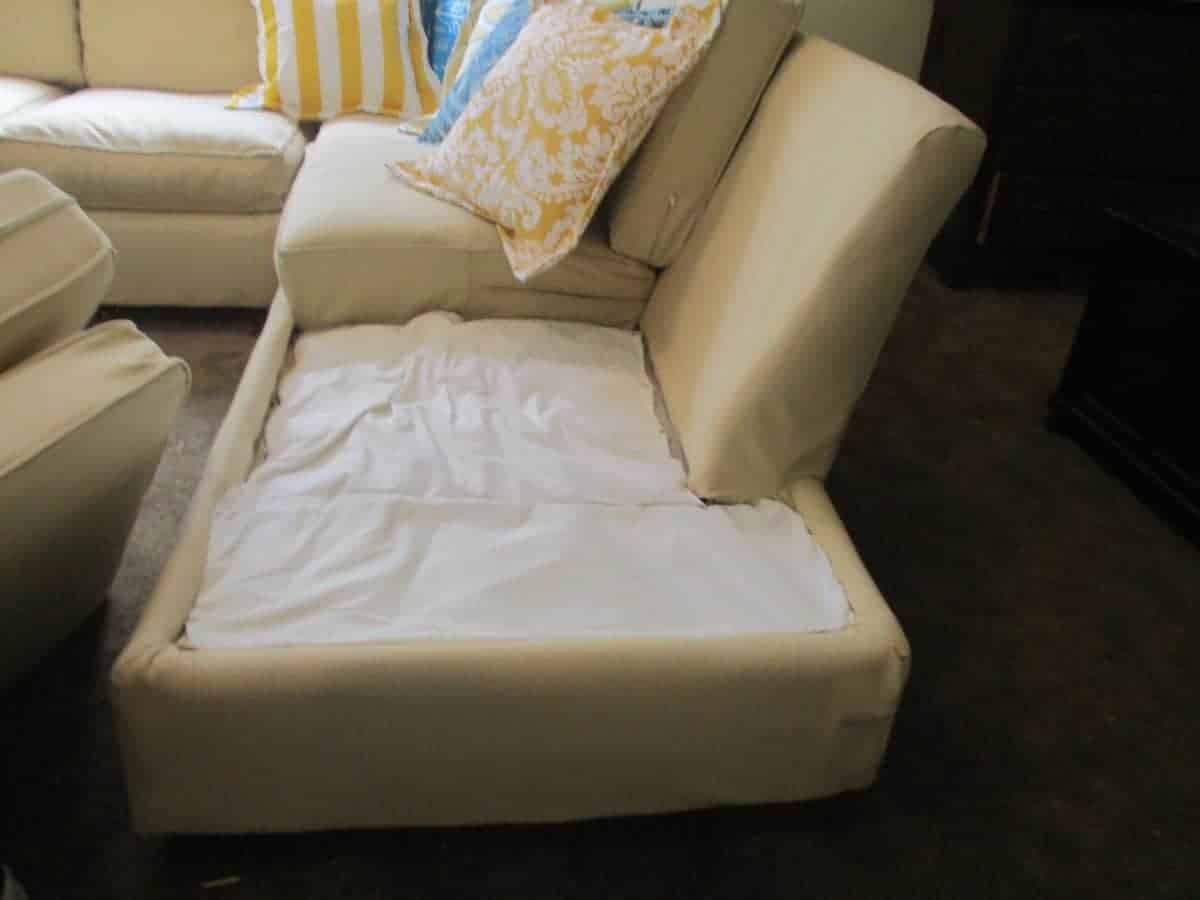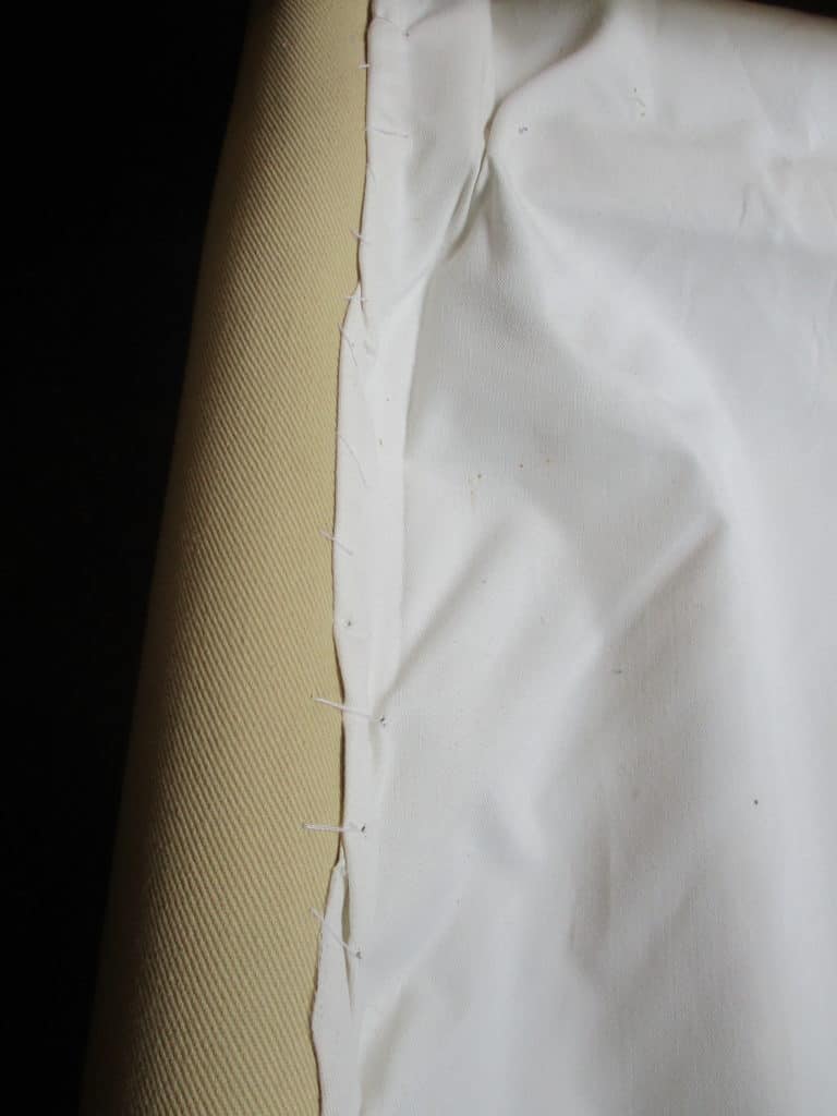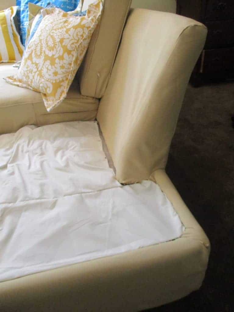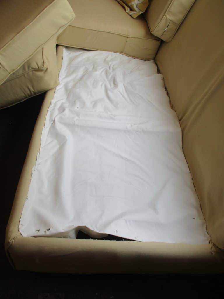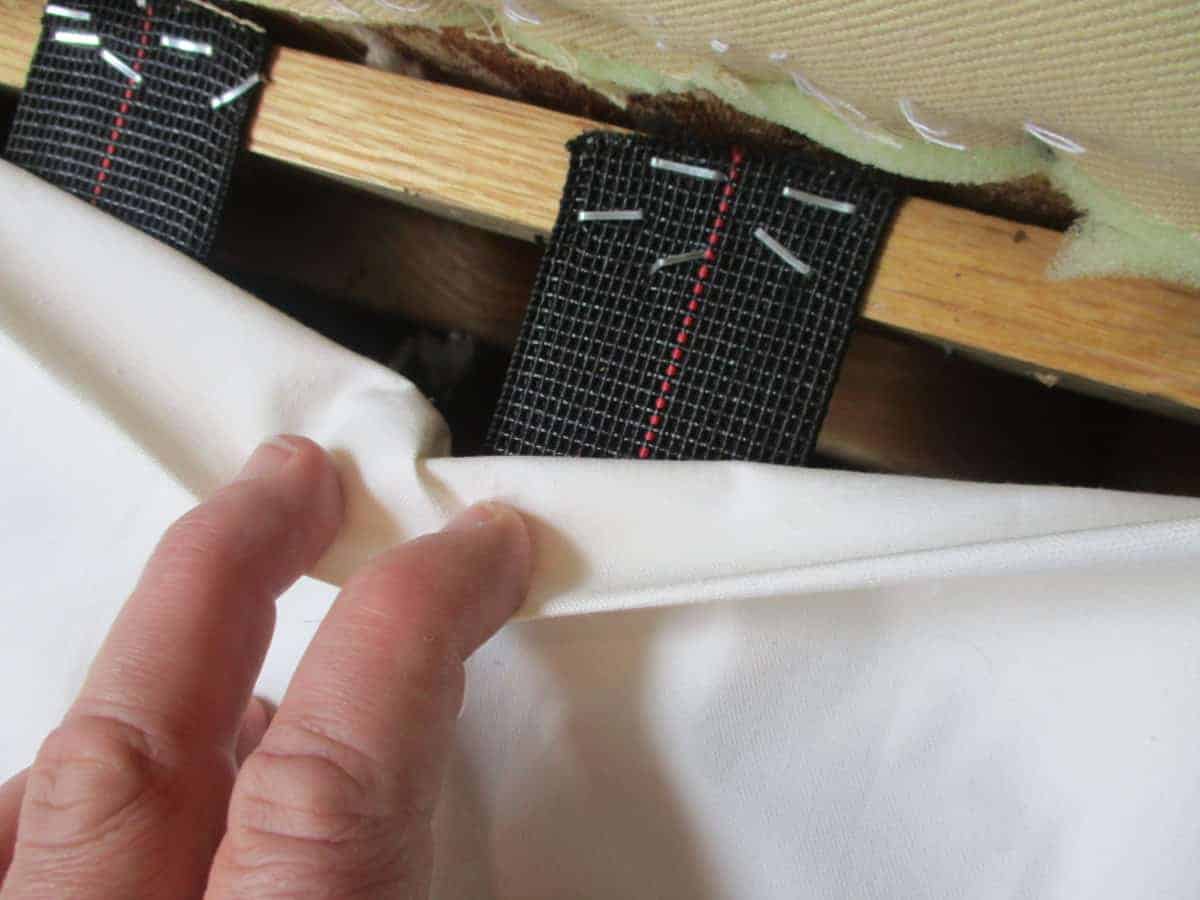 drapery lining fabric is hand-stitched in place to hide the ugly, mismatched platform and make it look tidy, and to keep objects from falling inside the couch and being lost forever You will notice that this fabric is non-removable and so cannot be thrown into your washing machine. However, these areas are the least likely to get dirty. You can sew a cover to fit over this fabric that is washable, but they have to be constantly adjusted to keep looking great, which is annoying, and it never looks really tight and secure, so I prefer to do it this way.