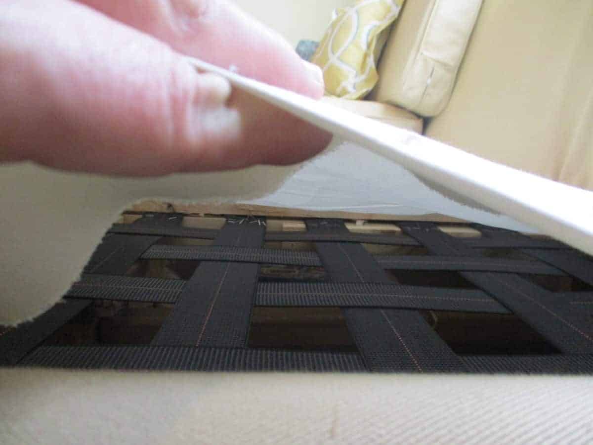 - Once the frame is built, you need to add the springs or webbing, or whatever you have picked, to the extensions you added to your couch. They will become the platform for the cushion to rest on. I chose elastbelt webbing for the reasons outlined in number 2 of the supplies section. It doesn’t matter at all if your old couch and new sections have different styles of springs–no one will ever see them.