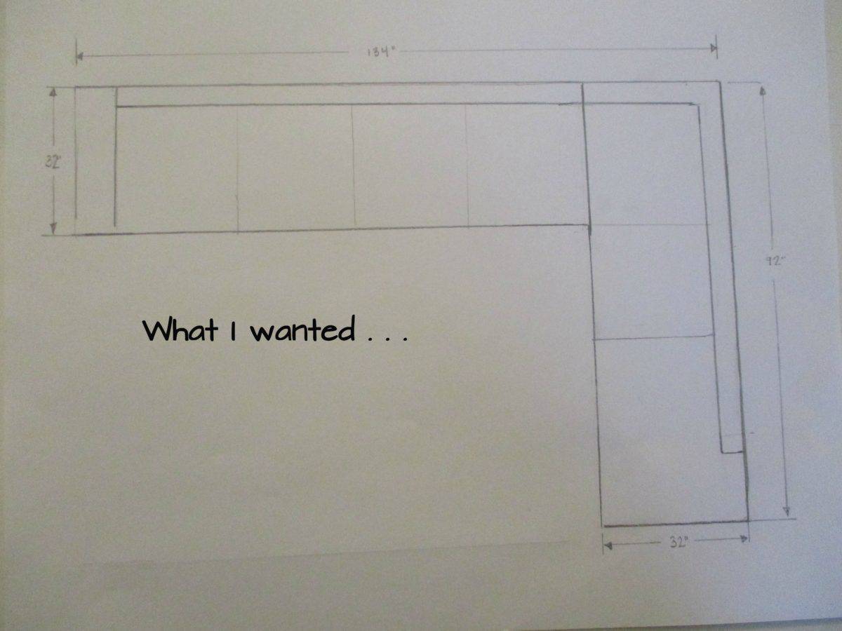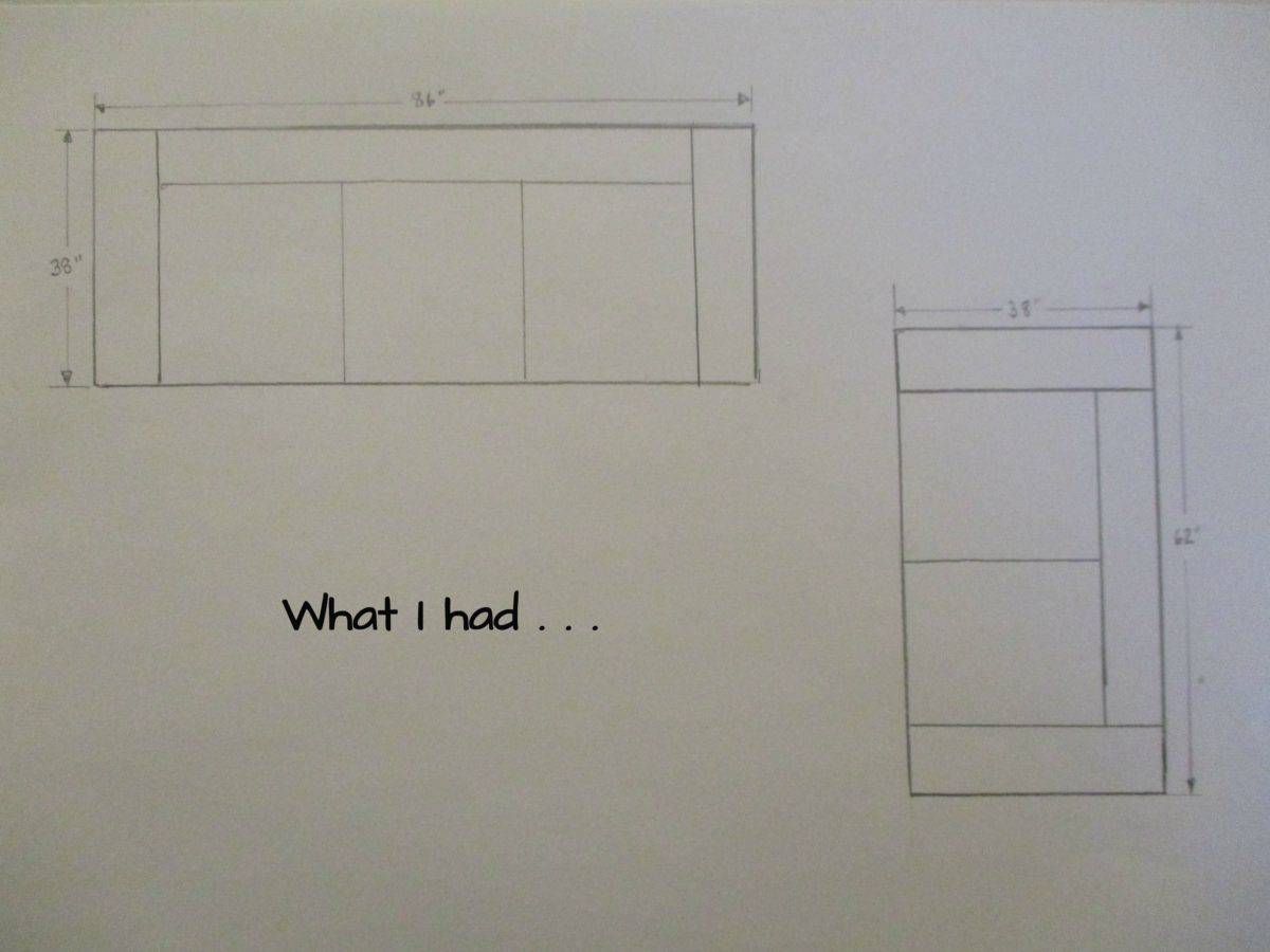 I drew out my vision, measuring the actual dimensions of the couch and loveseat, and then the dimensions I would like them to have and drawing it all out on graph paper. I redrew these for you so they would be tidy and legible.