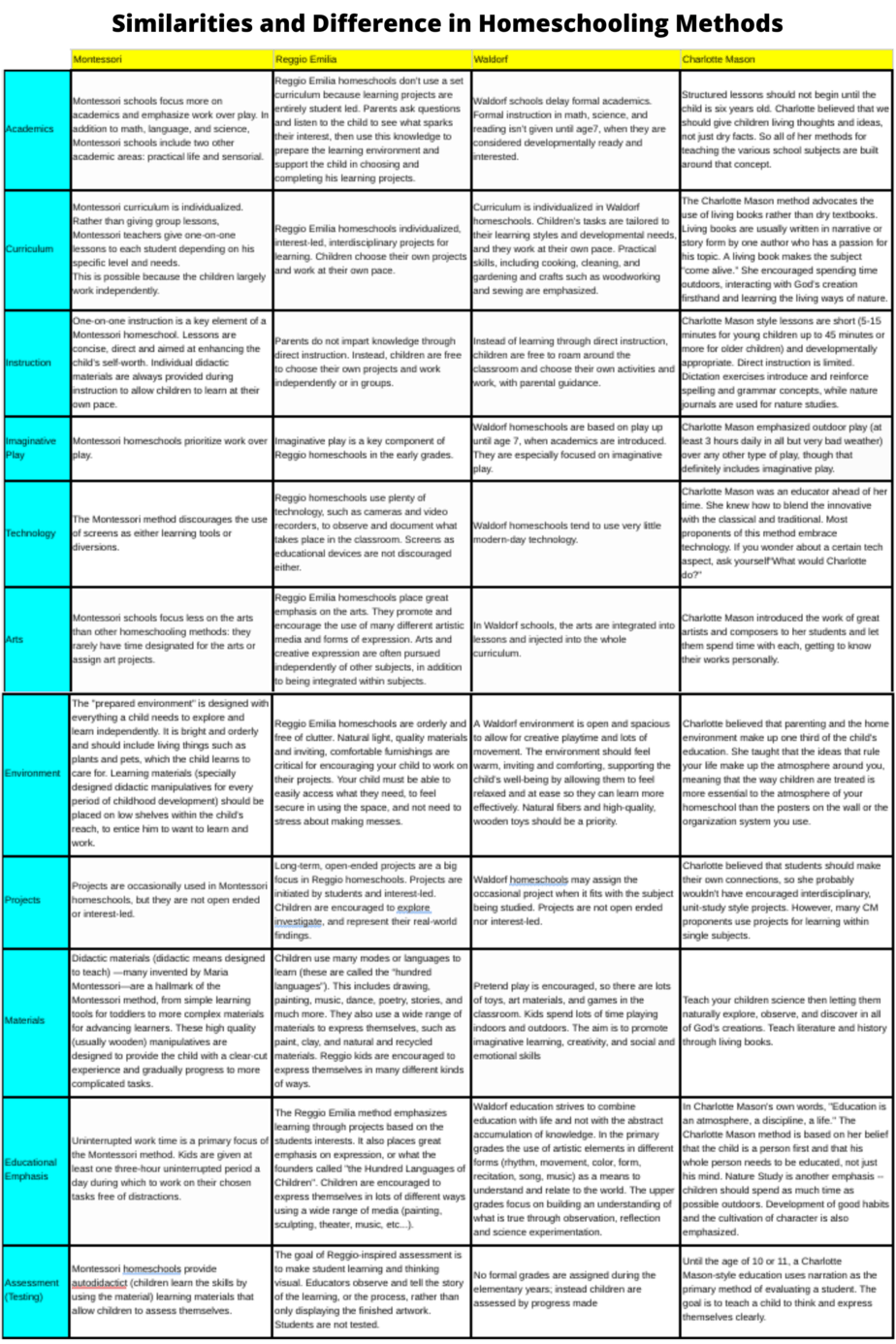 I realize that’s impossible to read. Feel free to download the Homeschooling Methods Chart pdf, so you can actually read it.